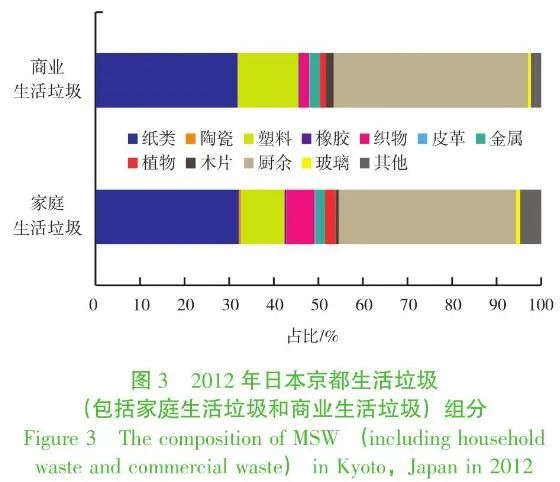 在垃圾組分上,通常經(jīng)濟越發(fā)達,廚余垃圾在全部生活垃圾中的占比就越低,而可回收物占比就越高。例如,日本京都廚余垃圾占家庭垃圾的40%左右(圖3),而美國廚余垃圾占垃圾總量的21.6%,都明顯低于中國廚余垃圾的占比。這意味著,在中國的收縮型城市,隨著經(jīng)濟的發(fā)展、人口的逐漸減少和廚余垃圾占比的降低,總的廚余垃圾產(chǎn)生量也會有所下降。參考上海、深圳等城市的生活垃圾組分,到2030年,收縮型城市廚余垃圾在全部生活垃圾中的占比可以按40%~50%估計。
