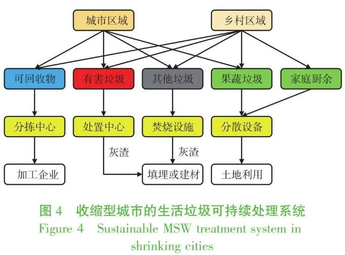 針對這一趨勢,收縮型城市生活垃圾管理應采用更為靈活的策略,在鄉(xiāng)村地區(qū)重點開展廚余垃圾的就地利用,在城市地區(qū)生活垃圾分為可回收物、有害垃圾和其他垃圾,而將果蔬垃圾作為重點廚余垃圾管理,同時加強源頭減量和適度分散處理,構(gòu)建以焚燒為核心的彈性處理系統(tǒng)。