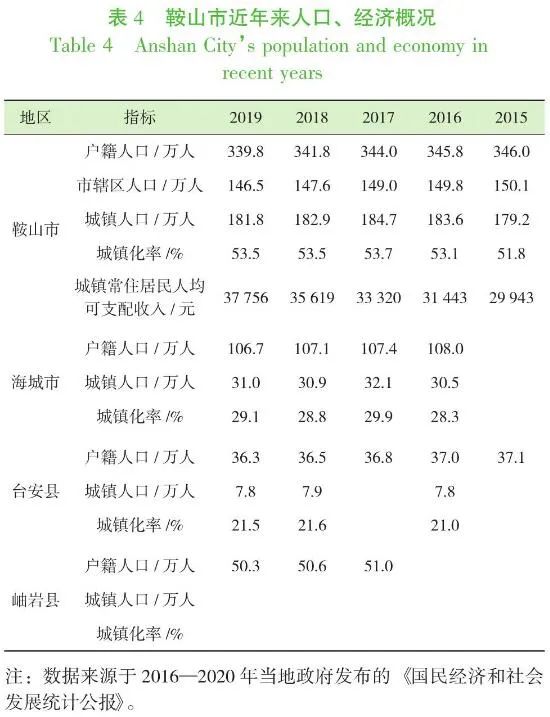為了進一步分析收縮型城市的具體特征,選擇鞍山作為典型大城市代表進行調(diào)查。鞍山是位于遼寧省中部的地級市,市區(qū)包括鐵東區(qū)、鐵西區(qū)、立山區(qū)、千山區(qū)等,下轄海城市、臺安縣、岫巖滿族自治縣。許多文獻將其作為典型的收縮型城市從城市學角度進行研究。同時,海城市作為縣級市,也是典型的收縮型小城市。