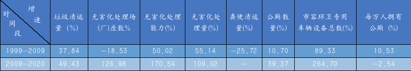 從上述統(tǒng)計看。截至1989年,全國只有37座生活垃圾無害化處理場(廠),雖然較1979年的12座翻了幾番,但與1999年數(shù)據(jù)相比,堪稱一窮二白,為避免數(shù)值失真,筆者在計算各指標(biāo)增速時僅從1999年開始,大致以每十年為一個跨度來計算,統(tǒng)計結(jié)果如表2所示。表2 1999-2020年全國市容環(huán)衛(wèi)行業(yè)各指標(biāo)增速