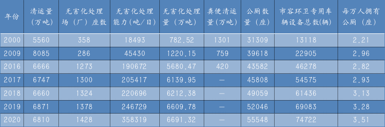 從表2可見,市容環(huán)衛(wèi)行業(yè)在2009年以后的發(fā)展可謂突飛猛進(jìn),從2009-2020年,全國垃圾清運量增加49.43%,相比1999-2009年間,增速提升了11.6個百分點;同一時期,無害化處理場數(shù)量增長126.98%,而前一個10年則是-18.53%;其他指標(biāo),垃圾無害化處理能力、垃圾無害化處理量、市容環(huán)衛(wèi)專用車輛設(shè)備總數(shù)均以倍速提升;公廁數(shù)量則增加了39.37%,而前一10年增速僅為10.70%。每萬人擁有的公廁數(shù)量是唯一一個下降的指標(biāo),考慮最近10年中國城市化的高速度,似乎也可以理解。最遺憾的還是糞便清運量,從2017年開始就無統(tǒng)計數(shù)據(jù),而歷史數(shù)據(jù)也是上下起伏不定。糞便處置不僅與廁所革命密切相關(guān),更關(guān)系到自然水體保護(hù)和食品安全,期待糞便處置能夠得到更多重視。《年鑒》顯示,2020年,全國縣城生活垃圾清運量達(dá)6810萬噸(約0.68億噸),總計擁有1428座無害化處理場(廠),生活垃圾處理能力358,319噸/日(約35.83萬噸/日),年無害化處理生活垃圾6691.32萬噸(約0.67億噸)??h城總計擁有公廁55,548座(5.55萬座),平均每萬人擁有公廁3.51座,全國縣城共擁有環(huán)衛(wèi)專用車輛設(shè)備74,722輛(約7.47萬輛)。表3 2000-2020年全國縣城市容環(huán)衛(wèi)總體情況(大致按年代跨度)