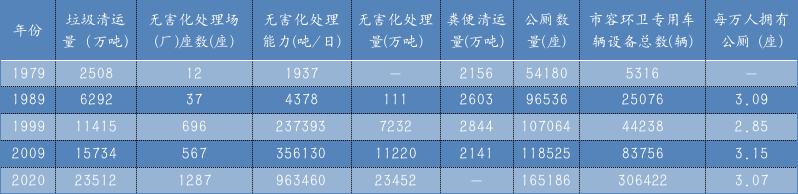 《年鑒》分別統(tǒng)計了城市、縣城和村鎮(zhèn)三部分市容環(huán)衛(wèi)大數(shù)據(jù),其中城市部分最為詳盡,包括了從1979-2020年的生活垃圾清運量、垃圾處理場(廠)數(shù)量、無害化處理能力、無害化處理量、糞便清運量、市容環(huán)衛(wèi)專用車輛設(shè)備總數(shù)、公廁數(shù)量及每萬人擁有公廁數(shù)(個別年份和統(tǒng)計項目空缺);縣城部分也包括上述統(tǒng)計項目,但日期是從2000年開始至2020年;村鎮(zhèn)部分則只有2020年數(shù)據(jù),統(tǒng)計項目只包含生活垃圾中轉(zhuǎn)站數(shù)量、環(huán)衛(wèi)專用車輛設(shè)備總數(shù)和公廁數(shù)量。《年鑒》顯示,2020年,全國城市生活垃圾清運量達(dá)23,512萬噸(約2.351億噸),總計擁有1287座無害化處理場(廠),生活垃圾處理能力963,460.15噸/日(約96.35萬噸/日),年無害化處理生活垃圾23,452萬噸(約2.345億噸)。全國城市擁有165,186座(約16.52萬座)公廁,平均每萬人擁有3.07座公廁,全國城市共擁有環(huán)衛(wèi)專用車輛設(shè)備306,422輛(約30.64萬輛)。表1 1979-2020年全國城市市容環(huán)衛(wèi)總體情況(大致按年代跨度)