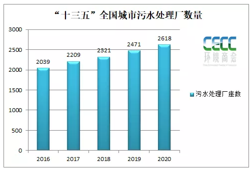 截至2020年,城市及縣城污水處理廠共4326座,較“十二五”末新增783座,其中,城市污水處理廠2618座,五年累計(jì)新增674座。污水廠處理能力19267萬立方米/日,較“十二五”末增長(zhǎng)37.2%。