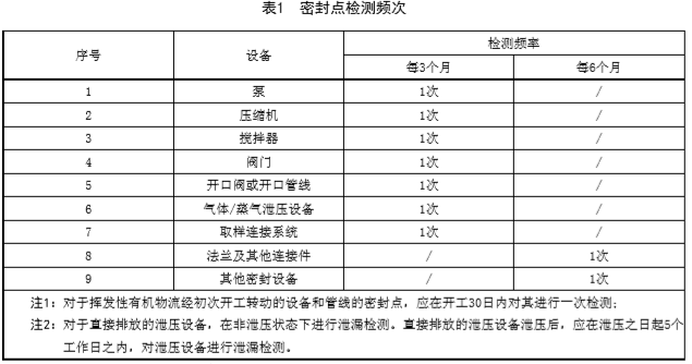 氣體、輕液接觸或流經(jīng)的密封點(diǎn)檢測(cè)頻次最低應(yīng)符合企業(yè)所屬行業(yè)標(biāo)準(zhǔn)規(guī)定的檢測(cè)頻次,所屬行業(yè)未發(fā)布標(biāo)準(zhǔn),執(zhí)行表1的檢測(cè)頻次。