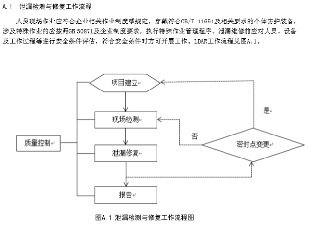 LDAR工作流程包括項(xiàng)目建立(資料收集、密封點(diǎn)識(shí)別、密封點(diǎn)檔案建立)、現(xiàn)場(chǎng)檢測(cè)和泄漏修復(fù)等 步驟。若企業(yè)因開(kāi)停工、檢維修以及改擴(kuò)建等原因發(fā)生密封點(diǎn)變更的,需重新建立密封點(diǎn)檔案后開(kāi)展現(xiàn) 場(chǎng)檢測(cè)和泄漏修復(fù)工作。LDAR工作流程按照附錄A進(jìn)行。