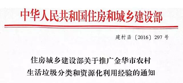 這份長達(dá)17頁的的通知中,住建部高度評價了2014年以來,金華市積極推進(jìn)農(nóng)村生活垃圾分類和資源化利用的探索,要求全國各省(區(qū)、市)住房城鄉(xiāng)建設(shè)或農(nóng)村生活垃圾治理業(yè)務(wù)主管部門要認(rèn)真學(xué)習(xí)金華經(jīng)驗,在本地區(qū)選擇3個以上代表性縣(市、區(qū)開展農(nóng)村生活垃圾分類和資源化利用示范,并組織編制實施方案,國家住房和城鄉(xiāng)建設(shè)部將組織專家進(jìn)行現(xiàn)場指導(dǎo)和評估。