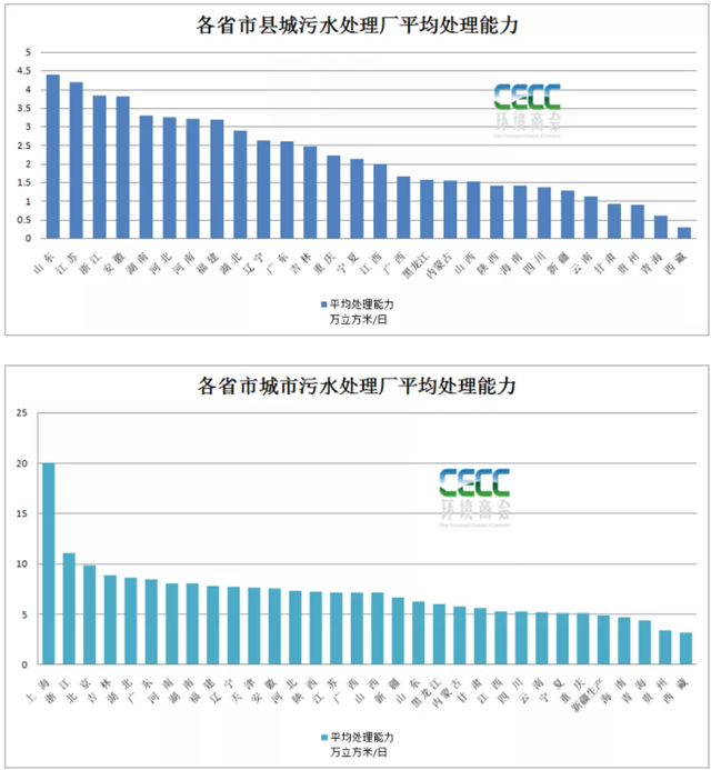 上一篇中提到的城市污水廠平均污水處理能力來看,除開上海的平均污水處理能力達20萬噸/日外,浙江省城市污水廠平均處理能力達11萬噸/日,吉林、湖北、廣東、河南、湖南等省市城市污水廠平均處理能力排在靠前的位置,大約在8萬噸/日??梢钥吹剑憬≡诔鞘泻涂h城的污水廠平均處理能力都排在前列,可見污水廠單體規(guī)模相對較大。山東、江蘇、安徽縣城污水處理廠平均處理能力較大,而城市污水處理廠則處在全國的中等水平。