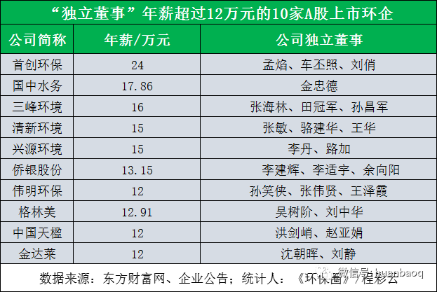 揭秘A股50家上市環(huán)企的132位獨(dú)董:簡單了解獨(dú)董職責(zé)之后,我們回歸環(huán)保行業(yè),談一談A股上市環(huán)企的獨(dú)立董事們。筆者查閱資料發(fā)現(xiàn),自從康美案落定后,A股上市環(huán)企中,還真有兩家上市環(huán)企獨(dú)董因個人原因提交了辭呈。一位是年薪僅5千元的富春環(huán)保獨(dú)立董事林潔,另一位是新三板公司博芳環(huán)保的獨(dú)立董事陳麗紅。兩個人都是因為“個人原因”提交的辭呈,巧合的是,辭職的時間都是在康美處罰案落地前后。排除這兩家之外,《環(huán)保圈》發(fā)現(xiàn),A股上市環(huán)企絕大多數(shù)獨(dú)立董事都比較淡定,沒有在敏感時期提出辭職。為了讓讀者進(jìn)一步了解上市環(huán)企獨(dú)董的背景,《環(huán)保圈》對A股50家上市環(huán)企中132位獨(dú)立董事進(jìn)行了逐一統(tǒng)計,從而進(jìn)一步觀察他們年薪、學(xué)歷、背景、從業(yè)經(jīng)歷。首先,每家上市環(huán)企外聘的獨(dú)立董事數(shù)量幾乎是一樣的,都是3-4個。這跟證監(jiān)會要求有關(guān),“上市公司獨(dú)立董事人數(shù)不得少于董事會成員的1/3”。由于環(huán)保上市企業(yè)本身規(guī)模不大,董事會成員大多在10人左右,所以匹配3-4個獨(dú)立董事最為合適。其次,從薪資上看,每家企業(yè)外聘獨(dú)立董事的工資也是不一樣的。最高的當(dāng)屬首創(chuàng)環(huán)保,分別給予孟焰、車丕照、劉俏教授年薪24萬/年;其次是國中水務(wù),其獨(dú)立董事金忠德薪酬17.86萬元/年;再者還有三峰環(huán)境、清新環(huán)境、興源環(huán)境、偉明環(huán)保、僑銀股份、格林美,中國天楹、金達(dá)萊等,這幾家企業(yè)對獨(dú)董也非常大方,年薪都在12萬/年以上,平均每月收入1萬元左右。▼獨(dú)立董事年薪超過12萬元的上市環(huán)企