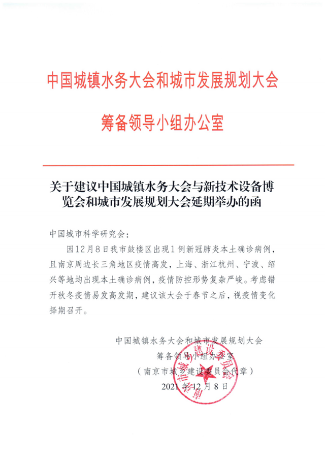 為切實(shí)保障與會(huì)專(zhuān)家學(xué)者、參會(huì)參展代表的健康安全,經(jīng)組委會(huì)慎重研究決定,原延期至2021年12月16日-17日在南京同期舉辦的“2021(第十六屆)中國(guó)城鎮(zhèn)水務(wù)發(fā)展國(guó)際研討會(huì)與新技術(shù)設(shè)備博覽會(huì)”和“2021(第十六屆)城市發(fā)展與規(guī)劃大會(huì)”很遺憾將延期召開(kāi),具體視疫情變化擇期召開(kāi)。