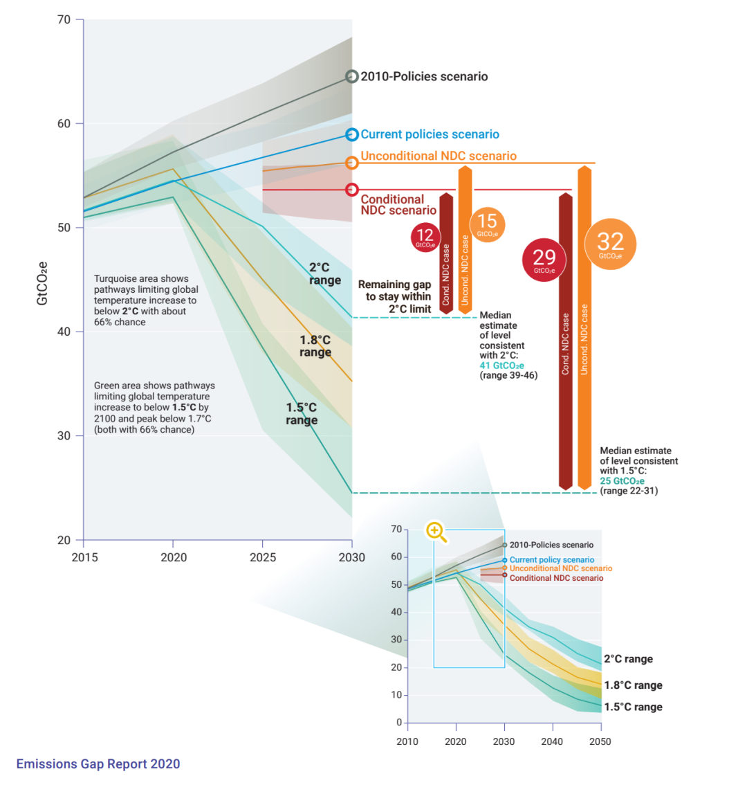 NDCs與預(yù)期溫控目標(biāo)的差距 來源:Emissions Gap Report 2020