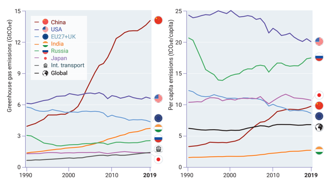 1990-2019年典型國家碳排放量和人均排放強(qiáng)度 來源:Emissions Gap Report 2020