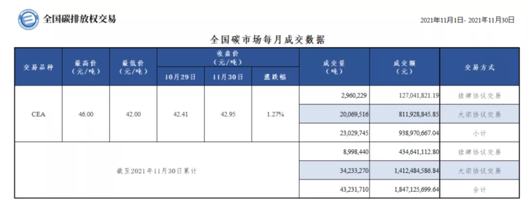 2021年7月全國碳市場在電力行業(yè)先行啟動,截至11月,全國碳市場碳排放配額(CEA)累計(jì)成交量4323萬噸,碳價約42-46元/噸,累計(jì)成交額18.47億元。
