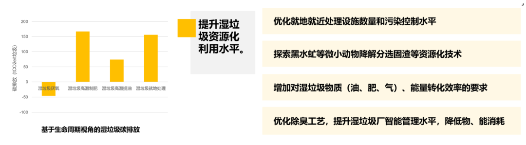 從生命周期視角估算,不同濕垃圾處理工藝碳排放差異較大,但是高能耗普遍是各類工藝優(yōu)化的重點(diǎn)。建議因地制宜選取處理工藝的同時,進(jìn)一步提升濕垃圾資源化利用水平。
