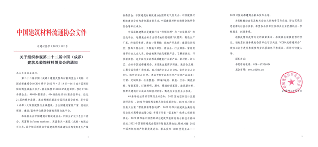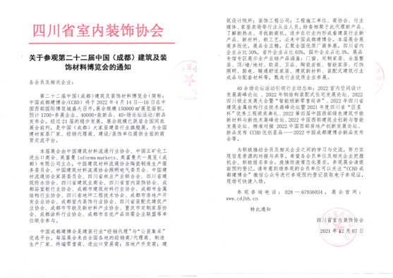 第二十二屆中國(成都)建筑及裝飾材料博覽會(以下簡稱:第二十二屆中國成都建博會)將于2022年4月14-16日在中國西部國際博覽城舉辦,15萬平米展出面積、預(yù)計(jì)1700+展商、120000參觀人次,目前展位預(yù)定已超85%。為打造“經(jīng)銷代理”與“公裝集采”的優(yōu)選商貿(mào)平臺,本屆展會現(xiàn)在已全渠道全面開啟線上線下宣傳推廣、專業(yè)觀眾邀請,深度覆蓋以四川為中心的西南各省市,觀眾群體涵蓋建材家居行業(yè)生產(chǎn)廠商、經(jīng)銷代理商、零售商、設(shè)計(jì)師、裝飾工程、開發(fā)商、建筑工程等,滿足參展企業(yè)招經(jīng)銷代理需求的同時更助力參展企業(yè)實(shí)現(xiàn)公裝集采貿(mào)易對接。