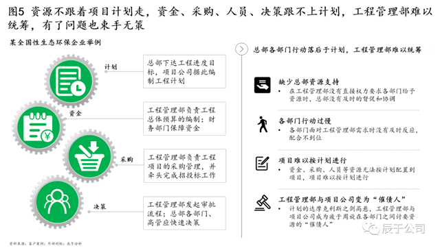 第二,項(xiàng)目公司、工程管理部與總部其他部門的博弈:項(xiàng)目管理是生態(tài)環(huán)保企業(yè)最重要的工作之一,項(xiàng)目公司和工程管理部是直接責(zé)任部門,自然希望其他部門能夠全力支持,但采購(gòu)、造價(jià)、財(cái)務(wù)、人力等部門卻有自己的指標(biāo)和約束,工程又經(jīng)常出現(xiàn)計(jì)劃外事項(xiàng),往往需要大力協(xié)調(diào)才能推得動(dòng),嚴(yán)重時(shí)其他部門可能成為阻力。