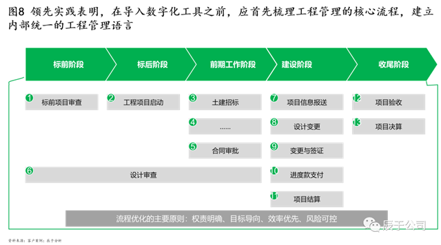 根據(jù)辰于經(jīng)驗(yàn),讓人倍受鼓舞的是,工程管理的數(shù)字化轉(zhuǎn)型是相對(duì)容易實(shí)現(xiàn)的,成效也相對(duì)很快。工程管理經(jīng)常涉及到大量數(shù)字、計(jì)算,這些工作對(duì)于計(jì)算機(jī)是容易的,而且工程管理較為模塊化,在數(shù)字化的實(shí)現(xiàn)上也會(huì)相對(duì)容易,其他行業(yè)已經(jīng)有成功產(chǎn)品。不過(guò)在導(dǎo)入數(shù)字化工具之前,梳理工程管理的核心流程、建立內(nèi)部統(tǒng)一的工程管理語(yǔ)言是非常必要的(見圖8)。
