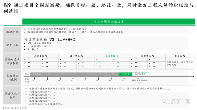 因此,工程管理的價(jià)值并非不可衡量,但是要有一定的前提——要有一個(gè)沒(méi)有水分的預(yù)算,和一個(gè)沒(méi)有偷工減料的結(jié)算。在以往服務(wù)的案例中,辰于將工程管理的激勵(lì)與整個(gè)項(xiàng)目全生命周期結(jié)合在一起,以整個(gè)項(xiàng)目的利潤(rùn)最大化為目標(biāo),設(shè)定各個(gè)階段的反向約束條件,使工程管理的價(jià)值量化評(píng)估,更重要的是,實(shí)現(xiàn)了項(xiàng)目全生命周期收益的最大化(見圖9)。