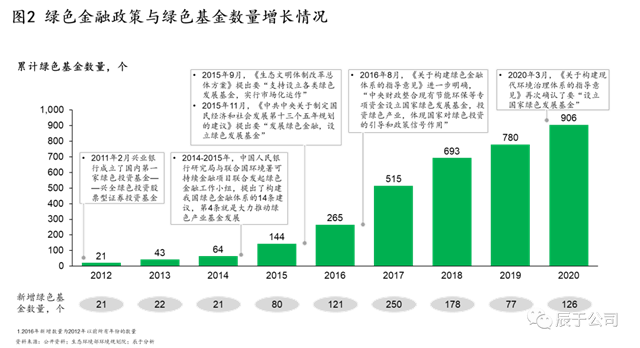 綠色金融是近年來行業(yè)發(fā)展的熱詞,包括綠色基金、綠色信貸、綠色債券、綠色保險等多種金融工具。以綠色基金為例,十三五期間先后發(fā)布了多個政策推動綠色產(chǎn)業(yè)基金發(fā)展,全國綠色基金的數(shù)量也增加了762個(見圖2)。其中2020年揭牌成立的國家綠色發(fā)展基金是生態(tài)環(huán)境保護領(lǐng)域第一個國家級政府投資基金,被認為是生態(tài)環(huán)境保護投融資機制改革取得歷史性突破和進展的標(biāo)志。