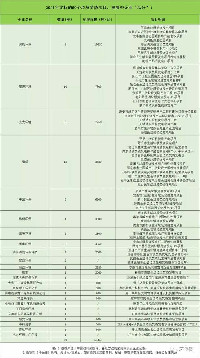 最后,我們從中標企業(yè)的角度,進一步觀察2021年定標的垃圾焚燒項目,被哪些企業(yè)“瓜分”了,這也是每年讀者最感興趣的話題。