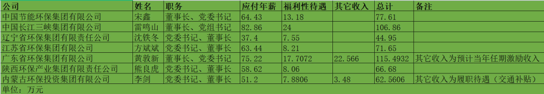 2021年的最后一天,國(guó)務(wù)院國(guó)資委發(fā)布《2020年度中央企業(yè)負(fù)責(zé)人薪酬披露》,公布了96家中央企業(yè)負(fù)責(zé)人的薪酬水平。其中,與環(huán)保行業(yè)有關(guān)的主要是兩家企業(yè),一家是中國(guó)節(jié)能環(huán)保集團(tuán)有限公司(下稱“中節(jié)能”),另一家是中國(guó)長(zhǎng)江三峽集團(tuán)有限公司(下稱“三峽集團(tuán)”)。兩家企業(yè),都是國(guó)家實(shí)施“長(zhǎng)江大保護(hù)”戰(zhàn)略的平臺(tái)型公司,作用都非常重要。兩家企業(yè)中,三峽集團(tuán)負(fù)責(zé)人的薪酬水平略高,董事長(zhǎng)、黨組書記雷鳴山的應(yīng)付年薪和福利性待遇(主要指社會(huì)保險(xiǎn)、企業(yè)年金、補(bǔ)充醫(yī)療保險(xiǎn)及住房公積金)總計(jì)達(dá)到106.86萬元,而中節(jié)能董事長(zhǎng)、黨委書記宋鑫則為77.61萬元。看完“國(guó)家隊(duì)”的,再來看看地方環(huán)保集團(tuán)的。在國(guó)務(wù)院國(guó)資委公布央企負(fù)責(zé)人薪酬水平的同時(shí),各地方國(guó)資委也公布了2020年度省屬企業(yè)負(fù)責(zé)人的薪酬信息,北極星環(huán)保網(wǎng)專門整理了5家地方環(huán)保集團(tuán)企業(yè)負(fù)責(zé)人的薪酬情況。這5家地方環(huán)保集團(tuán)分別是:遼寧省環(huán)保集團(tuán)有限責(zé)任公司、江蘇省環(huán)保集團(tuán)有限公司、廣東省環(huán)保集團(tuán)有限公司、陜西環(huán)保產(chǎn)業(yè)集團(tuán)有限責(zé)任公司和內(nèi)蒙古環(huán)保投資集團(tuán)有限公司。5家企業(yè)中,企業(yè)負(fù)責(zé)人薪酬最高的是廣東省環(huán)保集團(tuán)有限公司,其董事長(zhǎng)、黨委書記黃敦新應(yīng)付年薪為75.22萬元,福利性待遇17.7072萬元,另外還有22.5660萬元的預(yù)計(jì)當(dāng)年任期激勵(lì)收入,合計(jì)一共是115.4932萬元。薪酬最低的,是遼寧省環(huán)保集團(tuán)有限責(zé)任公司,黨委書記、董事長(zhǎng)沈鐵冬應(yīng)付年薪37.40萬元,福利性待遇7.55萬元,總計(jì)44.95萬元。其余3家企業(yè),負(fù)責(zé)人薪酬水平都差不太多,基本在60萬元-70萬元之間。全部看下來,可以看出,無論是“國(guó)家隊(duì)”還是地方環(huán)保集團(tuán),企業(yè)負(fù)責(zé)人的薪酬水平都不能算太高,超過100萬元的已屬于鳳毛麟角,大部分都在60萬元-70萬元左右。相對(duì)來說,南方企業(yè)總體來講比北方企業(yè)的薪酬水平要高一點(diǎn)。例如廣東、江蘇的地方環(huán)保集團(tuán),企業(yè)負(fù)責(zé)人薪酬就要比陜西、內(nèi)蒙古高,而遼寧在已公布的幾個(gè)省份中則是最低。▼2家環(huán)保央企和5家地方環(huán)保集團(tuán)企業(yè)負(fù)責(zé)人薪酬信息。制圖:環(huán)保圈看完環(huán)保行業(yè)央企和地方國(guó)資的高管薪酬情況,再來看看民企的。這方面,主要信息來源是各大環(huán)保上市公司的2020年的年報(bào)。具體的數(shù)據(jù),《環(huán)保圈》去年曾經(jīng)總結(jié)過,這里直接說結(jié)論。首先,我們統(tǒng)計(jì)了217位上市環(huán)保企業(yè)高管的薪酬水平,平均值是每人97萬元/年,接近“百萬元”吧。其次,雖然平均值達(dá)到了“百萬元”,但具體來看,每個(gè)人的情況差別還是很大的。最高的可以拿到625萬元,最低的則只有2.4萬元,足足相差了260倍。年薪最高的,是盈峰環(huán)境副總裁陳培亮,2020年年薪高達(dá)625萬元,可謂是環(huán)保領(lǐng)域的“最強(qiáng)打工人”。排名第二、第三的也是民企,他們分別是格林美的兩位高管——55歲的董事長(zhǎng)許開華(587萬元/年)和62歲的常務(wù)副總王敏(312萬元/年)。此外,年薪在150萬元以上的還有:中持股份副總經(jīng)理張翼飛、東江環(huán)保董事長(zhǎng)譚侃、節(jié)能國(guó)禎創(chuàng)始人李煒、東方園林董事長(zhǎng)劉偉杰、博天環(huán)境董事長(zhǎng)趙笠鈞、瀚藍(lán)環(huán)境總經(jīng)理金鐸、清新環(huán)境總裁李其林、維爾利董事長(zhǎng)李月中等。可以看出,這些企業(yè)絕大多數(shù)都是民企(2020年時(shí)中持、國(guó)禎、博天等尚未完成“混改”)。▼年薪過200萬的13位上市環(huán)保企業(yè)高管第三,再看看排名最低的,則來自于一家國(guó)企。2020年年薪最低的董事長(zhǎng)是富春環(huán)保董事長(zhǎng)萬嬌,只有2.5萬元,月平均工資約2000元。大家知道,富春環(huán)保是一家剛剛經(jīng)歷了“混改”的企業(yè),2020年南昌市國(guó)資委剛剛?cè)胫鳎f嬌則是由南昌國(guó)資提名,代替原董事長(zhǎng)的人選。當(dāng)然,民企高管的薪酬水平也并不一定都很高,也有偏少的。比如中國(guó)天楹,除總裁曹徳標(biāo)年薪36萬元外,其余副總裁一律年薪25萬元,月工資2.1萬。▼中國(guó)天楹高管團(tuán)隊(duì)收入(數(shù)據(jù)/東方財(cái)富網(wǎng))總體來看,排名靠前、薪酬較高的企業(yè),絕大多數(shù)都是業(yè)績(jī)表現(xiàn)好,坐落于北上廣深的大型環(huán)保上市企業(yè),如盈峰環(huán)境、格林美、中持股份、首創(chuàng)股份、綠色動(dòng)力、清新環(huán)境等。總體來看,“國(guó)家隊(duì)”、地方環(huán)保集團(tuán)企業(yè)負(fù)責(zé)人的薪酬屬于中上水平,不是很高,但也不算太低。民企這邊,則呈現(xiàn)出“兩極分化”的狀態(tài),有特別高的,也有比較低的。但總體來講,收入最高