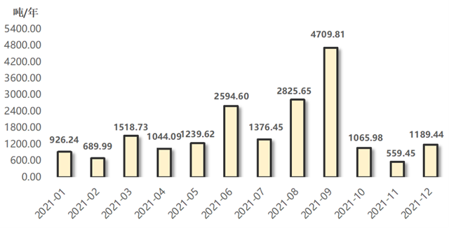 2021年,浙江省排污權(quán)成交量呈現(xiàn)攀高回落態(tài)勢,累計成交額達19740.09噸,較去年上升71.48%。由圖可知,9月成交量達到全年最高,為4709.81噸,11月成交量則是全年最低,為559.45噸。