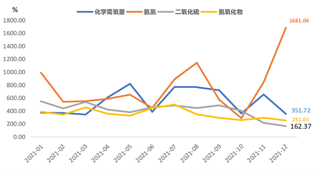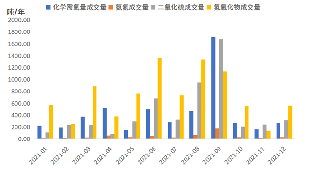 四項排污權(quán)成交量:化學需氧量全年成交量為5125.35 噸,9月達最高點1716.45噸,5月達最低點148.71噸;氨氮全年成交量為562.26噸,9月達最高點177.58噸,2月達最低點12.50噸;二氧化硫全年成交量為5367.35噸,9月達最高點1679.87噸,4月達最低點82.83噸;氮氧化物全年成交量為8685.07噸,6月達最高點1363.37噸,11月達最低點141.39噸。指標走勢顯示,2021年化學需氧量、氨氮、二氧化硫成交量走勢相近,8-9月是成交量大幅躍升的重要時點,9月收報單月成交量新高;氮氧化物成交量無明顯峰值,6月成交量震蕩攀升新高后,逐月緩慢下行。