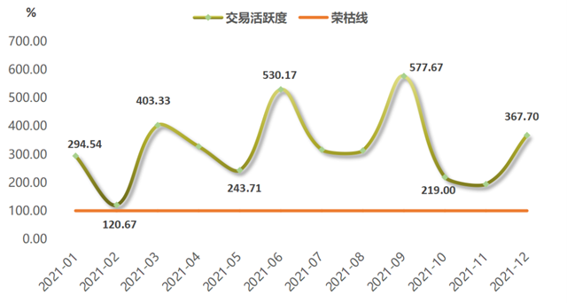 2021年,浙江省排污權(quán)交易市場活躍度全面向好,全年活躍度指數(shù)高于榮枯線。全年活躍度最高點位于9月的577.67點,最低點位于2月的120.67點。運行來看,2021年交易活躍度指數(shù)呈周期性波動,每季度末活躍度走勢顯著向好,年末指數(shù)收報于367.70點。