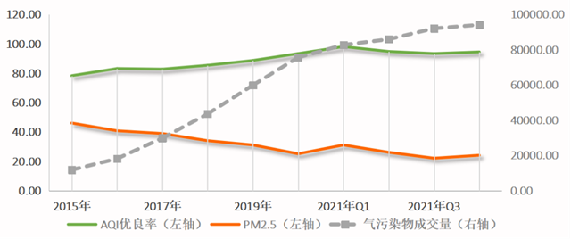 從環(huán)境改善情況來看,水污染物成交量(由化學需氧量和氨氮成交量構(gòu)成)與III類水質(zhì)以上省控斷面比例依舊呈高度正相關(guān)關(guān)系,顯著性水平小于0.01,皮爾遜相關(guān)系數(shù)為0.942。氣污染物成交量(由二氧化硫和氮氧化物成交量構(gòu)成)與浙江省AQI優(yōu)良率呈高度正相關(guān)關(guān)系,顯著性水平小于0.01,皮爾遜相關(guān)系數(shù)為0.953;氣污染物成交量與PM2.5指數(shù)呈高度負相關(guān)關(guān)系,顯著性水平小于0.01,皮爾遜相關(guān)系數(shù)為-0.957。