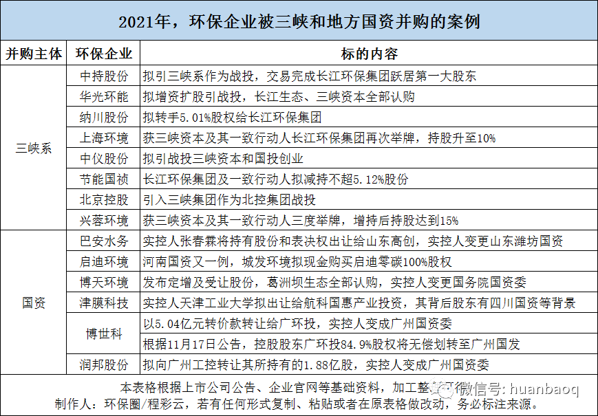 深:影響之深為近年來之最,去年發(fā)生的88起收并購,從某種意義上講已經(jīng)不是某些企業(yè)的戰(zhàn)略進與退,也不是傳統(tǒng)行業(yè)跨界環(huán)保這樣簡單,它背后傳遞的信號有央企、國資、民企、外企四股力量的競爭更迭,也有行業(yè)最徹底洗牌、低負債對高負債的清算等,意味深遠。并購頻率之多、交易金額之大,波及范圍之廣,產(chǎn)業(yè)影響之深,讓2021年環(huán)保產(chǎn)業(yè)收并購更加有看頭。在這一年里,我們不僅見證了世界級環(huán)保巨頭“老大并購老二”的一波三折,也領(lǐng)略了三峽、地方國資進擊環(huán)保行業(yè)的“兇猛”,還看到了部分民企賣資產(chǎn),國資接盤“混改”大潮的落幕。從2020年8月,威立雅首次提出要收購蘇伊士股份起,直到2021年12月14日,歐盟委員會正式批準二者收購交易,這場歷時1年零三個月,震驚環(huán)保圈的收購大案也進入收尾階段。最終的收購價,威立雅同意以每股20.50歐元的價格收購蘇伊士股份,要比最初的每股15歐元的報價加價不少。(詳情查閱:威立雅蘇伊士簽署合并協(xié)議,“洋水務(wù)”劍指中國市場?)去年6月,中國天楹宣布要15億歐元(折合人民幣約115億元)出售Urbaser 100%股權(quán),9月底就走完了各項流程,10月中下旬就披露完成了所有交割事項,速度非??欤z毫不拖泥帶水。對于這場收購案,媒體評價大都是正面,甚至有的還說中國天楹“里外躺贏”,在持有Urbaser的這些年中,中國天楹不僅在技術(shù)提升、產(chǎn)業(yè)鏈布局、海外業(yè)務(wù)、品牌影響力等方面獲益匪淺,而且通過買賣騰挪,中間除了掙了3.5億歐元投資差價之外,還把公司資產(chǎn)負債率,商譽減值風險都降低了,簡直是人生贏家。(詳情查閱:中國天楹擬15億歐元出售Urbaser,賠了or賺了?)“一波三折”的城發(fā)環(huán)境換股吸收合并啟迪環(huán)境案,從去年年初一直持續(xù)到8月,才經(jīng)過河南省財政廳及河南省國資委正式批復(fù),中間較為突破的是6月份,城發(fā)環(huán)境宣布擬12.8億元并購啟迪環(huán)境相關(guān)資產(chǎn),其中擬定10億元收購鄭州啟迪零碳100%股權(quán),2.81億元收購武漢啟迪生態(tài)所持的5家下屬公司95%股權(quán)。帶著政治任務(wù)而來的三峽集團,近兩年不斷擴大自己“朋友圈”,一旦被其看上,輕則舉牌增持股份,比如興蓉環(huán)境、上海環(huán)境就多次獲其增持;重則引入戰(zhàn)投,躍居大股東,比如中持,享受項目、訂單上的傾斜。據(jù)筆者不完全統(tǒng)計,2021年,三峽系通過三峽資本以及一致行動人長江生態(tài)環(huán)保集團,引戰(zhàn)投、舉牌增持上市環(huán)企高達8家,其中不僅有北控水務(wù)、上海環(huán)境、中持股份、興蓉環(huán)境等水務(wù)龍頭,還有華光環(huán)能、納川股份、中儀股份等細分領(lǐng)域的“強兵悍將”。最后的這個,不是某一家環(huán)保企業(yè),而是一類環(huán)保企業(yè)。從2018年起,環(huán)保行業(yè)的“混改潮”已經(jīng)持續(xù)了好幾年。本以為這場上市民企易主、國資混改的悲情大戲就要完結(jié)了,誰知去年還是斷斷續(xù)續(xù)有地方國資接盤上市民企案發(fā)生,兜兜轉(zhuǎn)轉(zhuǎn),博世科、巴安水務(wù)、博天環(huán)境、潤邦股份、啟迪環(huán)境終于在去年成功聯(lián)姻國資,抱上了金主大腿。▼圖五:三峽系和地方國資增持并購環(huán)保案例