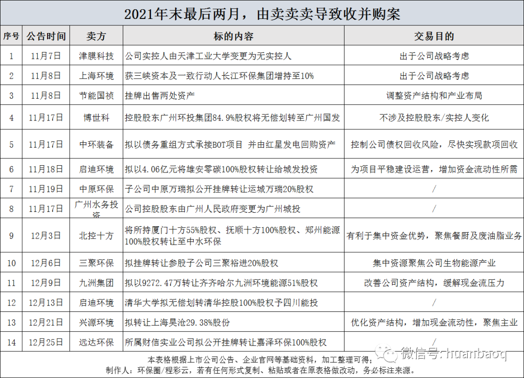 全:類型之全為近年來之最,不同于以往單一跨界并購或者延伸產(chǎn)業(yè)鏈,去年88起并購案交易類型更加全面。既有出于戰(zhàn)略考慮,完善產(chǎn)業(yè)鏈上下游,迅速占領(lǐng)某個地區(qū)市場的;也有極個別傳統(tǒng)產(chǎn)業(yè)跨界轉(zhuǎn)型而來,搶灘環(huán)保的(環(huán)衛(wèi)賽道尤其突出);還有像光大環(huán)境、城發(fā)環(huán)境、海天水務(wù)、高能環(huán)境等優(yōu)質(zhì)企業(yè),為了進一步增厚原有項目規(guī)模,直接收購成熟運營資產(chǎn)的。但更多的是,不少我們熟知的上市環(huán)企為了降低負債、保存實力“過冬”、緩解資金流動壓力,開始“賣賣賣”,小至某個污水處理廠、垃圾焚燒廠股權(quán)出售,大至整個公司實控人發(fā)生變更,年末最后兩月累計發(fā)生的26起并購交易案,其中“賣賣賣”占據(jù)一半,高達14起。▼圖四:年末最后兩月26起并購交易案,“賣賣賣”占據(jù)一半