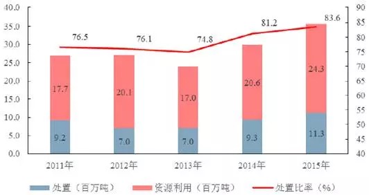2011-2015年中國(guó)工業(yè)危險(xiǎn)廢物處理情況