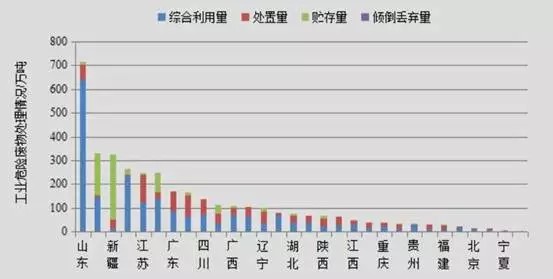 目前,國(guó)內(nèi)工業(yè)危險(xiǎn)廢物產(chǎn)生量大部分集中在東部、西北部工業(yè)化地區(qū)。根據(jù)環(huán)保局的統(tǒng)計(jì)數(shù)據(jù)顯示,2014年,各地區(qū)工業(yè)危險(xiǎn)廢物產(chǎn)生量較大的省份為山東709.8萬(wàn)噸,占全國(guó)工業(yè)企業(yè)危險(xiǎn)廢物產(chǎn)生量的19.5%;青海325.7萬(wàn)噸,占全國(guó)工業(yè)企業(yè)的9.0%;新疆319.3萬(wàn)噸,占全國(guó)工業(yè)企業(yè)的8.8%;湖南260.6萬(wàn)噸,占全國(guó)工業(yè)企業(yè)的7.2%;江蘇243.3萬(wàn)噸,占全國(guó)工業(yè)企業(yè)的 6.7%。下圖是2014年我國(guó)工業(yè)危險(xiǎn)廢物的地區(qū)處理情況: