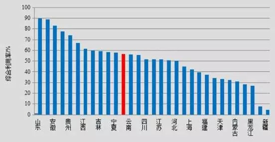 由于國(guó)家對(duì)危廢的管理實(shí)行“就近式、集中式”原則,亦使得危廢處理區(qū)域性特點(diǎn)明顯。2014年,工業(yè)危險(xiǎn)廢物綜合利用量較大的省份為山東639.8萬(wàn)噸,占全國(guó)工業(yè)企業(yè)危險(xiǎn)廢物綜合利用量的31.0%;湖南232.5萬(wàn)噸,占全國(guó)工業(yè)企業(yè)的11.3%;青海146.0萬(wàn)噸,占全國(guó)工業(yè)企業(yè)的7.1%;云南137.1萬(wàn)噸,占全國(guó)工業(yè)企業(yè)的6.6%;江蘇125.3萬(wàn)噸,占全國(guó)工業(yè)企業(yè)的6.1%;全國(guó)工業(yè)危險(xiǎn)廢物綜合利用率為56.4%。共有11個(gè)省份工業(yè)危險(xiǎn)廢物綜合利用率超過(guò)全國(guó)平均水平,其中山東、湖南和安徽超過(guò)80%。下圖是2014年我國(guó)各地區(qū)工業(yè)危險(xiǎn)廢物綜合利用率: