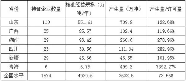危廢產(chǎn)生量超出核準(zhǔn)經(jīng)營(yíng)規(guī)模的省份(2014年)
