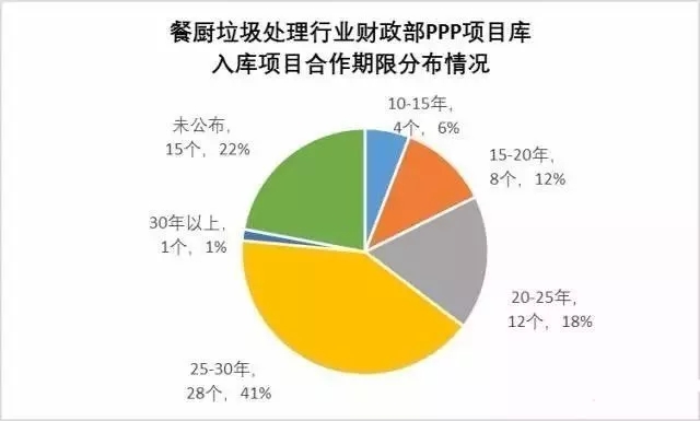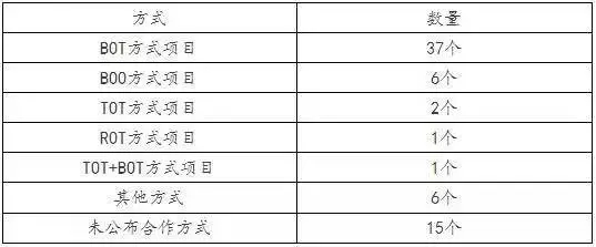 項目合作期限呈現(xiàn)短期、長期少,中期多的分布,這與其他行業(yè)PPP項目的分布形態(tài)基本一致,另外還有15個項目尚未識別完畢或不再推進,未公布合作期限。