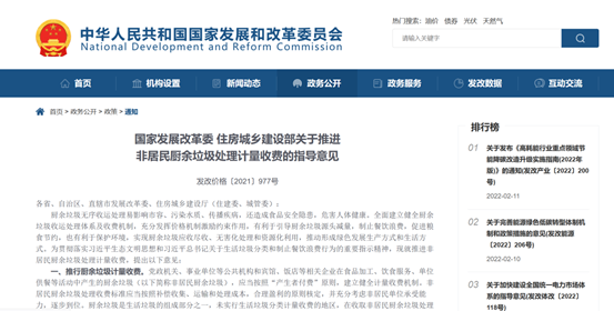 從國家層面和各地已出臺政策來看,垃圾計量收費路線圖日漸清晰,“非居民廚余垃圾垃圾處理計量收費”和“非居民生活垃圾處理計量收費”先行先試已陸續(xù)展開,為日后普及“居民用戶生活垃圾按量收費”探路。2022年1月12日,國務(wù)院辦公廳轉(zhuǎn)發(fā)《國家發(fā)展改革委等部門關(guān)于加快推進城鎮(zhèn)環(huán)境基礎(chǔ)設(shè)施建設(shè)指導(dǎo)意見的通知》(簡稱“通知”)(國辦函〔2022〕7號)。通知要求:全面落實生活垃圾收費制度,推行非居民用戶垃圾計量收費,探索居民用戶按量收費,鼓勵各地創(chuàng)新生活垃圾處理收費模式,不斷提高收繳率。2021年11月15日,寧波市發(fā)展和改革委員會、寧波市綜合行政執(zhí)法局關(guān)于印發(fā)《寧波市非居民生活垃圾處理計量收費機制改革方案》的通知(征求意見稿)。2021年12月20日,寧波市發(fā)展和改革委員會、寧波市綜合行政執(zhí)法局下發(fā)《關(guān)于調(diào)整非居民生活垃圾處理計量收費標準及有關(guān)事項的通知》(甬發(fā)改價格〔2021〕569號),通知于2022年4月1日起實施。2017年9月30日,杭州市城市管理委員會印發(fā)《杭州市區(qū)非居民生活垃圾處理計量和收費管理辦法》,本辦法自2018年1月1日起實施。2021年7月2日,國家發(fā)展改革委、住房城鄉(xiāng)建設(shè)部印發(fā)《國家發(fā)展改革委 住房城鄉(xiāng)建設(shè)部關(guān)于推進非居民廚余垃圾處理計量收費的指導(dǎo)意見》(發(fā)改價格〔2021〕977號),提出:推行廚余垃圾計量收費,逐步建立非居民廚余垃圾定額管理和超定額累進加價機制。2021年8月31日,北京市城市管理委員會、北京市發(fā)展和改革委員會、北京市財政局、北京市市場監(jiān)督管理局聯(lián)合下發(fā)《關(guān)于加強本市非居民廚余垃圾計量收費管理工作的通知》(京管發(fā)〔2021〕19號)2021年9月18日,廣東省發(fā)展改革委、廣東省住房和城鄉(xiāng)建設(shè)廳轉(zhuǎn)發(fā)《國家發(fā)展改革委住房和城鄉(xiāng)建設(shè)部關(guān)于推進非居民廚余垃圾處理計量收費的指導(dǎo)意見》(簡稱《指導(dǎo)意見》),并提出3點意見,包括建立健全非居民廚余垃圾處理計量收費機制、加快推進廚余垃圾收運監(jiān)管體系建設(shè)等,要求各地市一并貫徹執(zhí)行。2021年9月23日,甘肅省發(fā)展和改革委員會、甘肅省住房和城鄉(xiāng)建設(shè)廳下發(fā)《關(guān)于推進非居民廚余垃圾處理計量收費有關(guān)工作意見的通知》(甘發(fā)改價格〔2021〕624號),要求,蘭州市作為第一批生活垃圾分類示范城市,應(yīng)當盡快實現(xiàn)非居民廚余垃圾計量收費,并充分征求公眾意見,逐步建立超定額累進加價機制;其他城市要摸清非居民單位垃圾產(chǎn)生量底數(shù),加快實現(xiàn)非居民廚余垃圾收運監(jiān)管全覆蓋,逐步推進計量收費。2022年1月28日,新疆維吾爾自治區(qū)發(fā)展改革委、住房和城鄉(xiāng)建設(shè)廳關(guān)于印發(fā)《自治區(qū)推進非居民廚余垃圾處理計量收費實施方案》的通知(新發(fā)改規(guī)〔2022〕4號),《方案》提出推行非居民廚余垃圾計量收費。
