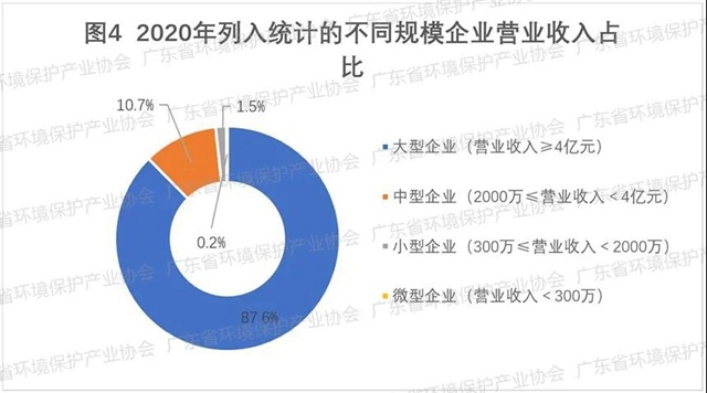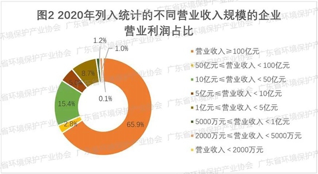 2020年,列入統(tǒng)計范圍的1607家企業(yè)的營業(yè)收入、營業(yè)利潤、環(huán)保業(yè)務(wù)營業(yè)收入、從業(yè)人員高度集中于營業(yè)收入在1億元以上的企業(yè),其以11.3%的企業(yè)數(shù)量占比,貢獻(xiàn)了93.9%的營業(yè)收入、88.1%的環(huán)保業(yè)務(wù)營業(yè)收入97.7%的營業(yè)利潤,吸納了78.5%的從業(yè)人員。