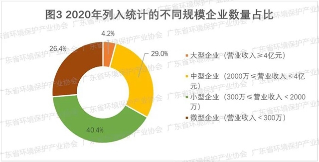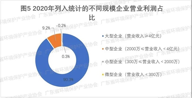 與2019年數(shù)據(jù)進(jìn)行可比分析表明,2020年,統(tǒng)計范圍內(nèi)相同樣本企業(yè)營業(yè)收入總額、環(huán)保業(yè)務(wù)營業(yè)收入、營業(yè)利潤、從業(yè)人員均同比增長了8.4%、15.8%、18.4%、1.0%。大型企業(yè)營業(yè)收入、營業(yè)利潤同比實現(xiàn)雙增長,中、小、微型企業(yè)的營業(yè)收入、營業(yè)利潤同比則出現(xiàn)雙下滑,可見,我省中小微型企業(yè)生存較為艱難。