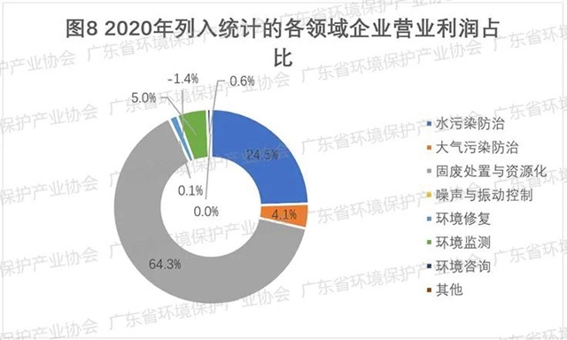 在環(huán)境服務(wù)細(xì)分領(lǐng)域方面,2020年環(huán)境服務(wù)企業(yè)的從業(yè)單位主要分布在水污染防治、環(huán)境監(jiān)測和大氣污染防治3大領(lǐng)域,在營業(yè)收入及營業(yè)利潤方面,水污染防治和固廢處置與資源化2大領(lǐng)域的營業(yè)收入之和與營業(yè)利潤之和分別占據(jù)了80.0%、73.0%的市場份額。