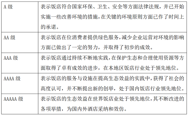 我國于2007年發(fā)布了《綠色飯店等級(jí)評(píng)定規(guī)定》,根據(jù)企業(yè)在提供綠色服務(wù)、保護(hù)環(huán)境等方面做出的努力將綠色酒店分為五個(gè)等級(jí),具體內(nèi)容如下。