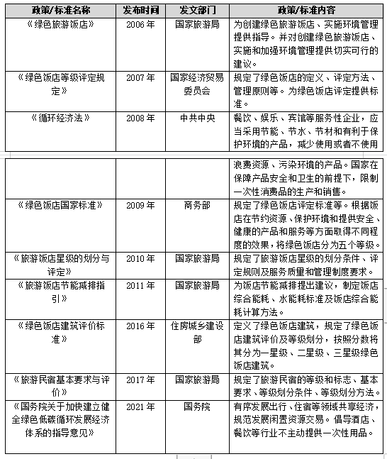 近年來,隨著我國綠色低碳發(fā)展意識(shí)的不斷提高以及碳達(dá)峰、碳中和目標(biāo)的提出,相關(guān)部門出臺(tái)了一系列有關(guān)綠色飯店的相關(guān)政策及標(biāo)準(zhǔn)。2006年,我國首次發(fā)布《綠色旅游飯店》標(biāo)準(zhǔn),規(guī)定了創(chuàng)建綠色旅游飯店、實(shí)施和改進(jìn)環(huán)境管理的要求。在此之后,我國相繼出臺(tái)了有關(guān)綠色酒店的標(biāo)準(zhǔn),如《綠色飯店等級(jí)評(píng)定規(guī)定》、《綠色飯店國家標(biāo)準(zhǔn)》、《綠色飯店建筑評(píng)價(jià)標(biāo)準(zhǔn)》等。2021年2月,國務(wù)院印發(fā)《國務(wù)院關(guān)于加快建立健全綠色低碳循環(huán)發(fā)展經(jīng)濟(jì)體系的指導(dǎo)意見》,指出我國需有序發(fā)展出行、住宿等領(lǐng)域共享經(jīng)濟(jì),規(guī)范發(fā)展閑置資源交易。我國需倡導(dǎo)酒店、餐飲等行業(yè)不主動(dòng)提供一次性用品?!兑庖姟返挠“l(fā)進(jìn)一步強(qiáng)調(diào)了我國酒店住宿行業(yè)綠色低碳發(fā)展的重要性及必要性。住宿作為人們出行必不可少的環(huán)節(jié),酒店住宿行業(yè)綠色低碳轉(zhuǎn)型是減少我國旅游業(yè)碳排放的重要因素。