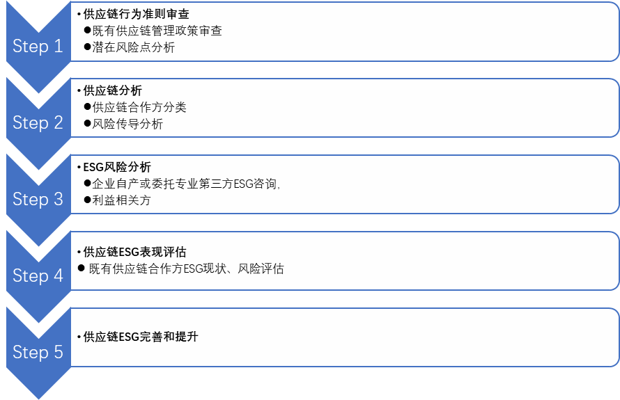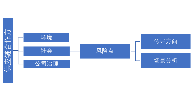 1.企業(yè)自查或委托專業(yè)第三方ESG咨詢,明確供應(yīng)鏈相關(guān)產(chǎn)業(yè)重要ESG風(fēng)險點,進(jìn)行直接和間接風(fēng)險分析。通過內(nèi)部核查、外部資料參考、盡職調(diào)查等方式,從內(nèi)部明確供應(yīng)鏈ESG實踐、風(fēng)險和能力提升需關(guān)注的要素。