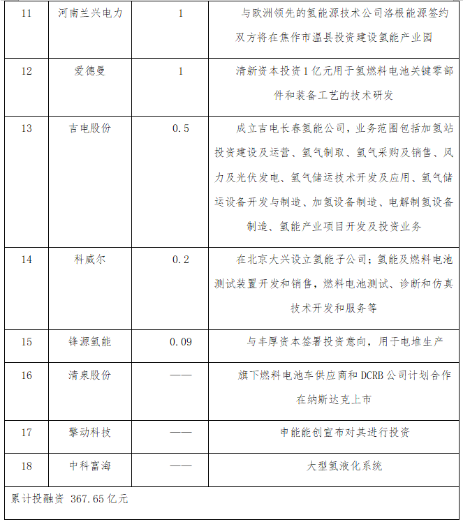 表1 2021年上半年我國氫能投融資情況(資料來源:氫能匯,Choice)