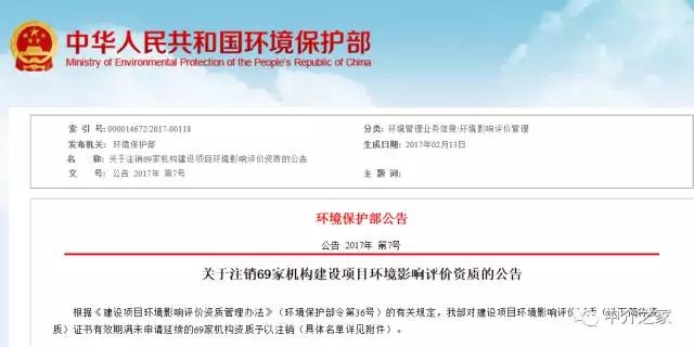 關于注銷69家機構建設項目環(huán)境影響評價資質的公告