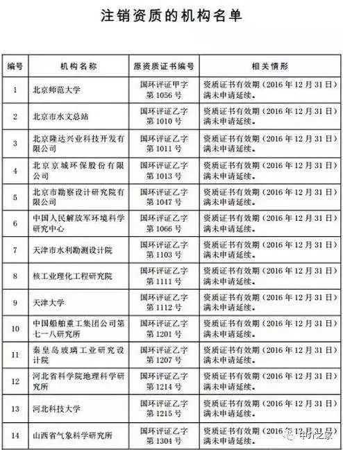 據(jù)固廢觀察不完全統(tǒng)計,近一年多來環(huán)保部發(fā)布的相關公告包括:2015年10月13日注銷北京大學等9家,2015年12月29日注銷寧波大學等6家,2016年2月2 日注銷江西省農業(yè)科學院等42家,2016年3月2日注銷青島大學等31家,2016年7月11日注銷天津市環(huán)境影響評價中心等29家,2016年12月24日注銷昆明市環(huán)境科學研究院等13家,2017年2月10日注銷北京師范大學等69家。