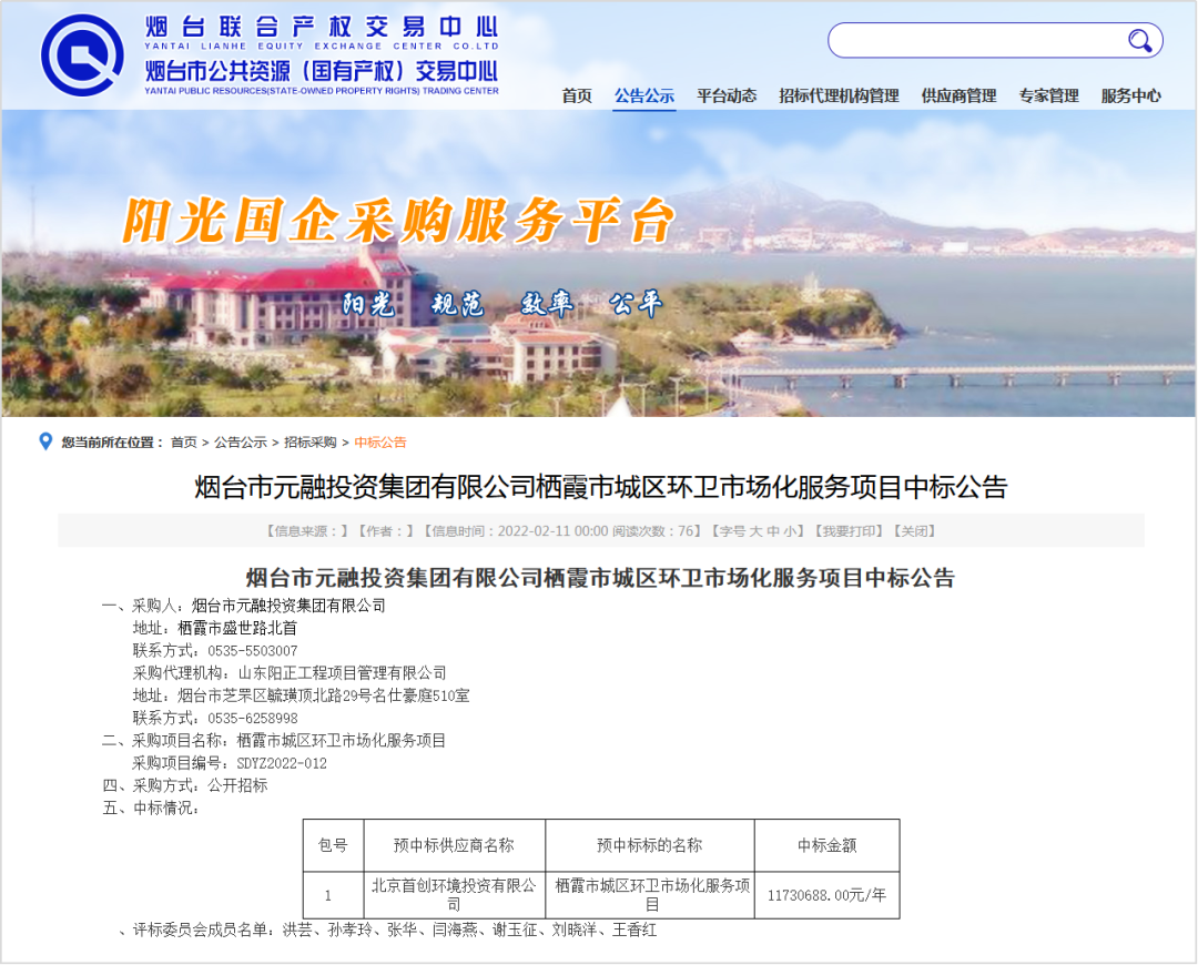 煙臺市公共資源(國有產(chǎn)權(quán))交易中心消息,2022年2月11日,煙臺市元融投資集團有限公司棲霞市城區(qū)環(huán)衛(wèi)市場化服務項目開標,中標結(jié)果如下: