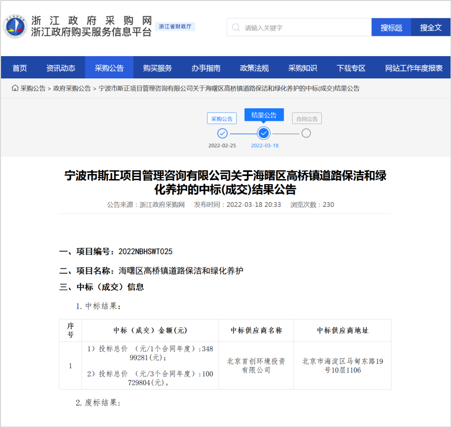 浙江省政府采購網(wǎng)消息,2022年3月18日,寧波市海曙區(qū)高橋鎮(zhèn)道路保潔和綠化養(yǎng)護項目開標,中標結(jié)果如下: