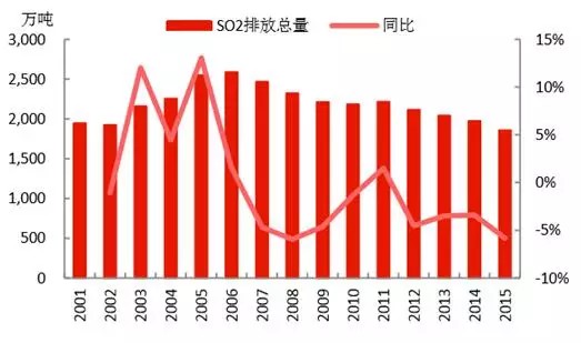 SO2的排放量為1859萬(wàn)噸,每年基本以4%左右的速度下降,而收關(guān)年2015年下降速度高達(dá)5.84%;