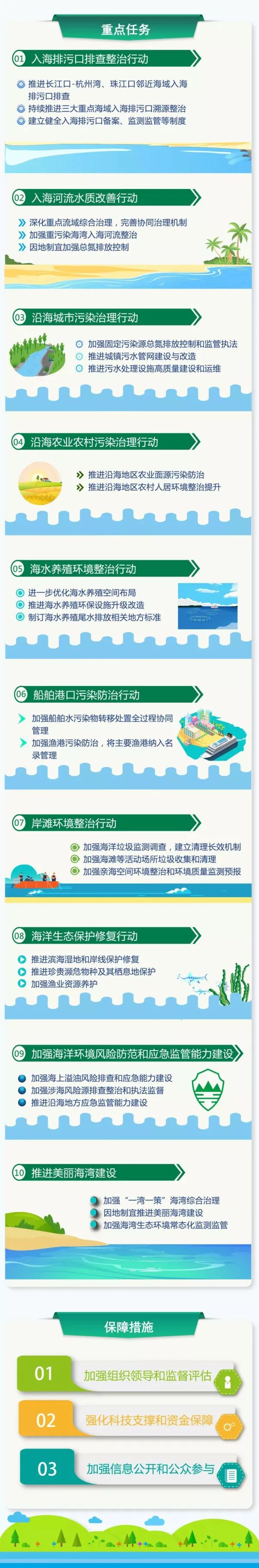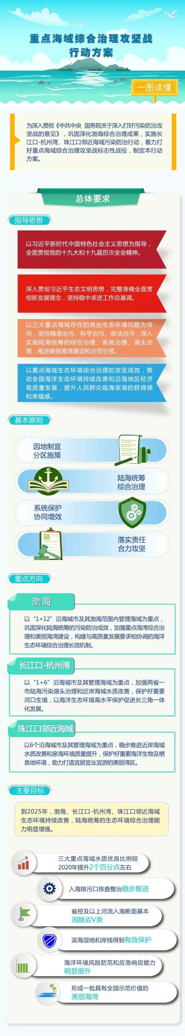 《重點(diǎn)海域綜合治理攻堅(jiān)戰(zhàn)行動(dòng)方案》提出開(kāi)展:入海排污口排查整治行動(dòng)、入海河流水質(zhì)改善行動(dòng)、沿海城市污染治理行動(dòng)、沿海農(nóng)業(yè)農(nóng)村污染治理行動(dòng)、海水養(yǎng)殖環(huán)境整治行動(dòng)、船舶港口污染防治行動(dòng)、岸灘環(huán)境整治行動(dòng)、海洋生態(tài)保護(hù)修復(fù)行動(dòng)等“七大行動(dòng)”。