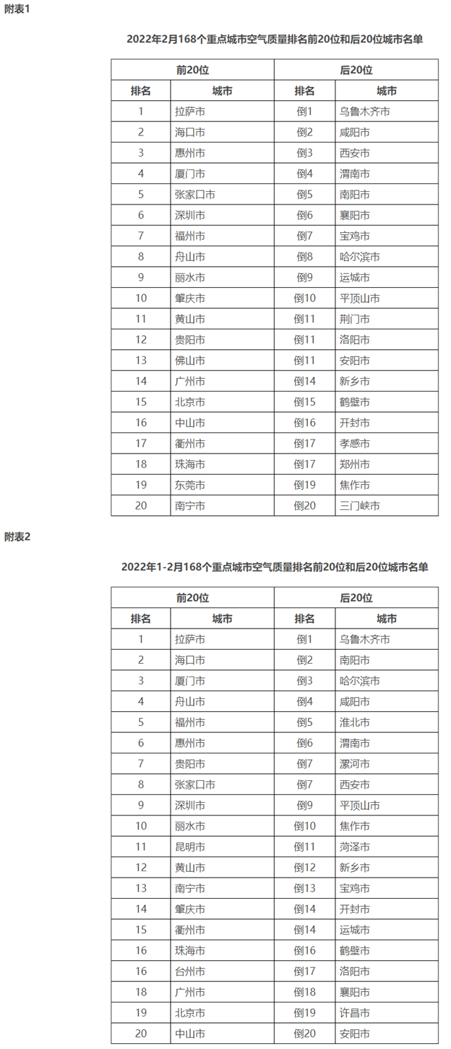 2月,168個重點城市中,拉薩、??诤突葜菔械?0個城市空氣質(zhì)量相對較好(從第1名至第20名);烏魯木齊、咸陽和西安市等20個城市空氣質(zhì)量相對較差(從倒數(shù)第1名至倒數(shù)第20名),見附表1。